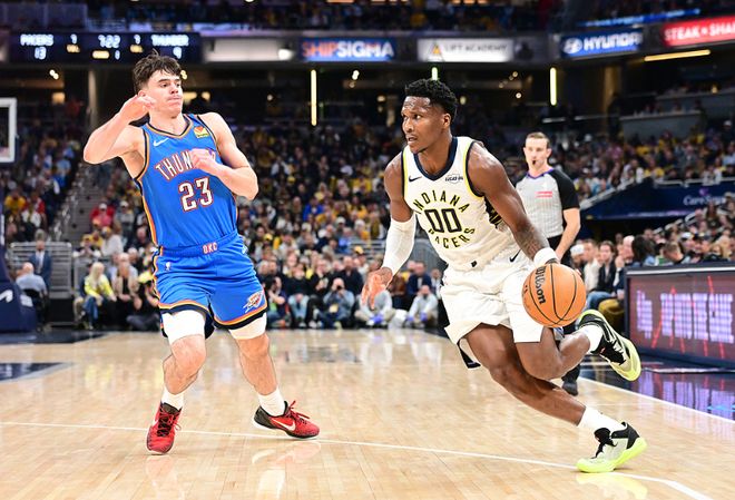 北京时间10月24日,NBA常规赛卫冕冠军雷霆客场对阵步行者,双方迎来上赛季总决赛后的首次交锋,哈利伯顿因伤缺席。雷霆成为历史首支前两场均双加时球队,雷霆上半场领先步行者7分,内姆哈德左肩酸痛提前退赛,步行者顽强反扑追平,亚历山大常规时间错失绝杀三分,首个加时赛亚历山大再次错失绝杀。第二个加时赛马瑟林6犯毕业,亚历山大成为本赛季首位单场50+球员,且创造生涯单场得分新高纪录,亚历山大与维金斯连续得分取得领先,最终雷霆141-135双加时战胜步行者收获2连胜,步行者遭遇新赛季开门黑。
